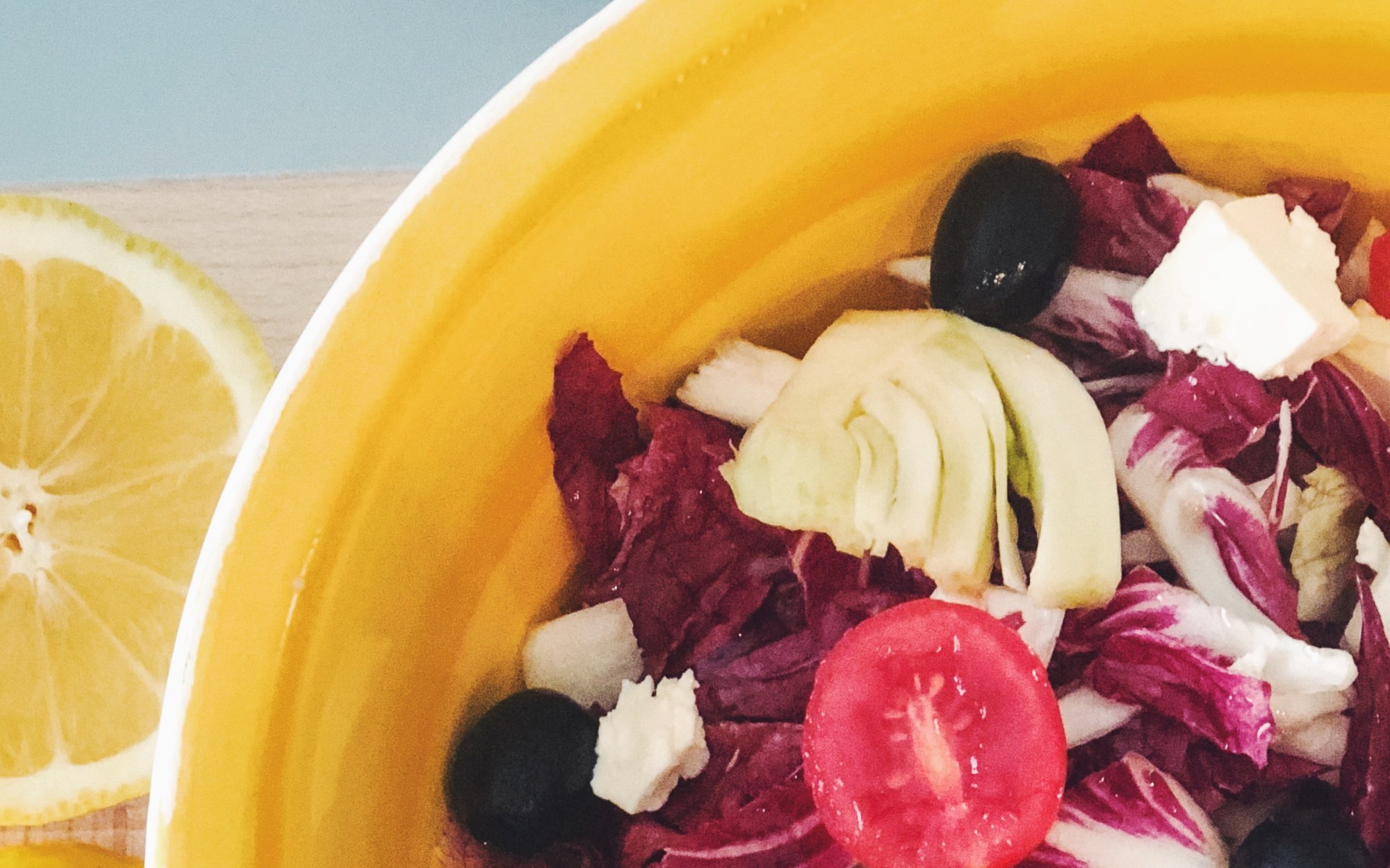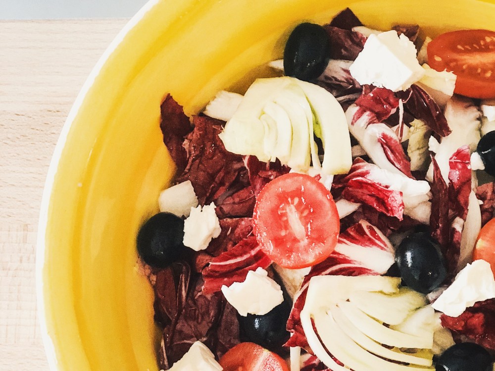 Provate questa insalata: mondare e lavare del radicchio rosso, insalata belga, finocchi. Aggiungere i pomodorini e condire il tutto con olio e limone (o aceto come preferite), un pizzico si sale, pepe e noce moscata emulsionando il tutto. Amalgamare bene e terminare l’insalata aggiungendo alcune olive denocciolate e del formaggio feta qua e là. Ottima!